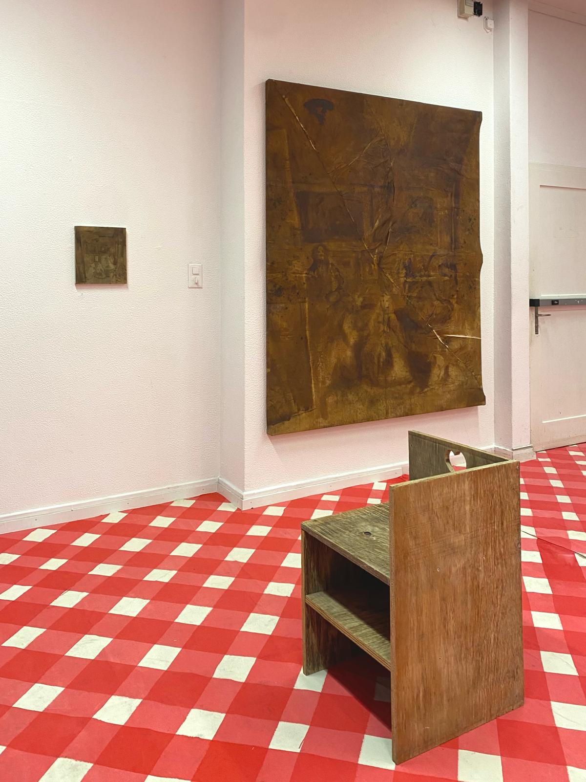 Wie das rot-weisse Muster am Boden und an den Wänden mich an Tischdecken erinnerte und ich Hunger bekam. Wie mir ein grosses braunes Bild aufgefallen ist, die Leinwand quer vernarbt und ich in der Ölfarbe braunes Iod zur Desinfektion von Wunden zu sehen glaubte. Und wie uns in dem Moment erzählt wurde, dass das Haus bald abgerissen werden würde, zuerst aber der Strom und das Wasser abgestellt wird. Wie wenn Künstler:innen dankbar sein sollten für einen Raum ohne Strom und Wasser. Wie ich dachte, wie Mensch denkt, dass Kunst auch im dunkeln stattfinden kann, dass es egal ist, wie toxisch der Boden oder schimmlig der Raum. Wie ich dem Gedanken nicht länger Raum geben wollte, weil Menschen die so denken nicht noch mehr Raum bekommen sollten. Wie wir draussen Passanten sagen hörten „was würdest du für das Bild bezahlen“. Wie ich mir dachte, dass die Menschen auf breiten Bahnen mit Leitplanken gehen, ihnen nichts mehr bleibt ausser zynisch zu sein und wir uns im Kunstraum auf dem karierten Tischtuchmuster wie Schachfiguren verhielten – Dame von E1 auf H4.